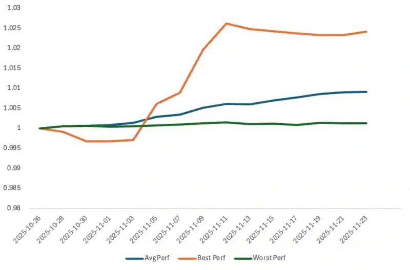 Fund performance was calculated using Time-Weighted Return (TWR) methodology with assets aligned as of October 25, 2025, and benchmarked against funding arbitrage performance.