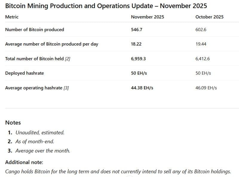 DALLAS, Dec. 5, 2025 /PRNewswire/ – Cango Inc. (NYSE: CANG) (“Cango” or the “Company”) today published its Bitcoin production and mining operations update for November 2025.